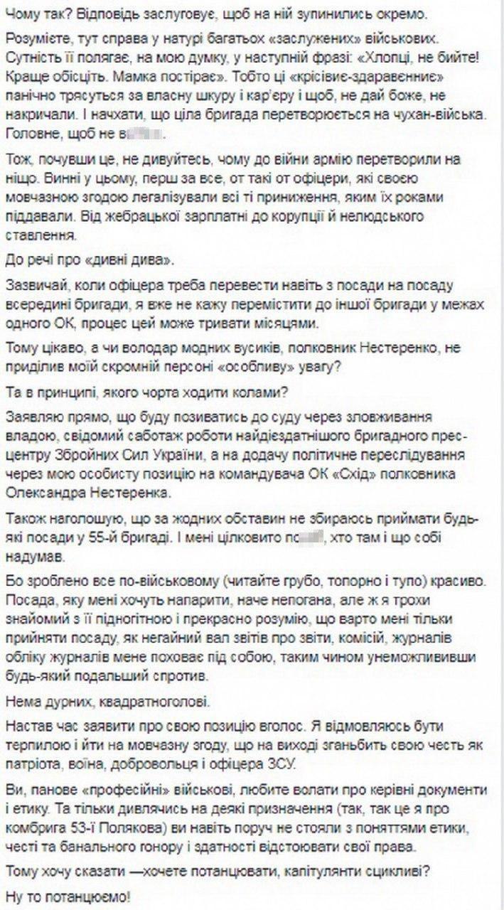 «…хочу заявить, что никому не позволю себя чмырить и не собираюсь менять свои взгляды и выводы относительно нынешних руководителей. Сейчас, в такое важное для страны время, я отказываюсь прятать голову в песок», — пишет «ВСУшник».