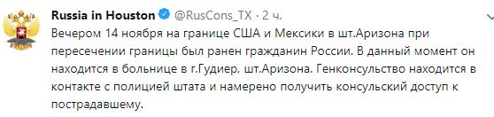 «Вечером 14 ноября при пересечении границы США и Мексики в штате Аризона был ранен гражданин России. В данный момент он находится в больнице в городе Гудиер, штат Аризона. Генконсульство России в Хьюстоне находится в контакте с полицией штата и намерено получить консульский доступ к пострадавшему», — говорится в сообщении диппредставительства.