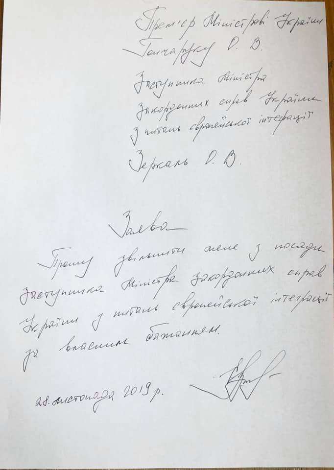 Замминистра иностранных дел Украины по вопросам европейской интеграции Елена Зеркаль написала заявление об увольнении. Об этом дипломат сообщила на своей странице в социальной сети.