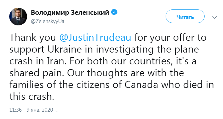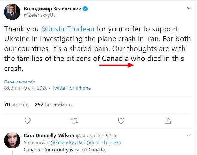 В 8:03 9 января в Twitter появилась запись, в которой Зеленский заявил, что мыслями пребывает с гражданами Канадии (Canadia). Один из комментаторов заметил, что страна называется Канада.