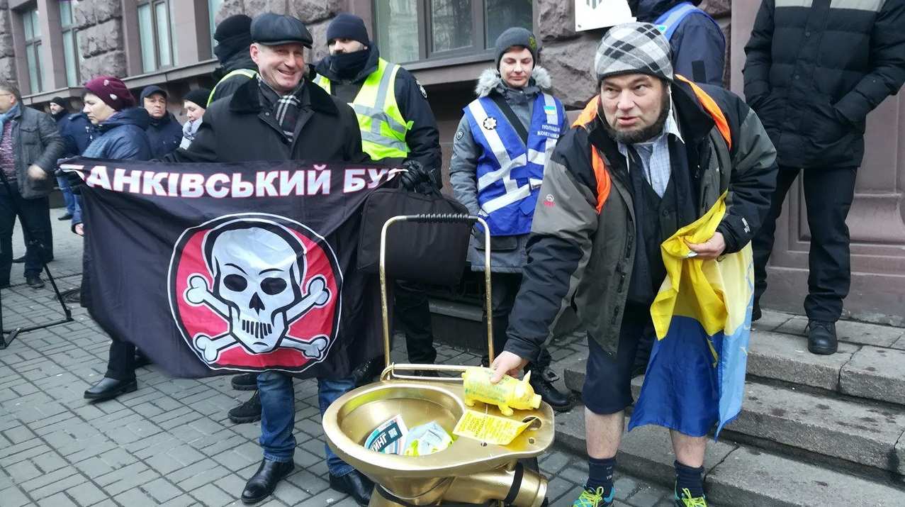 Ещё до приезда Порошенко протестующие успели сцепиться с одним из его критиков, который пришёл к зданию ГБР с унитазом, символизирующим коррупцию команды бывшего главы государства.