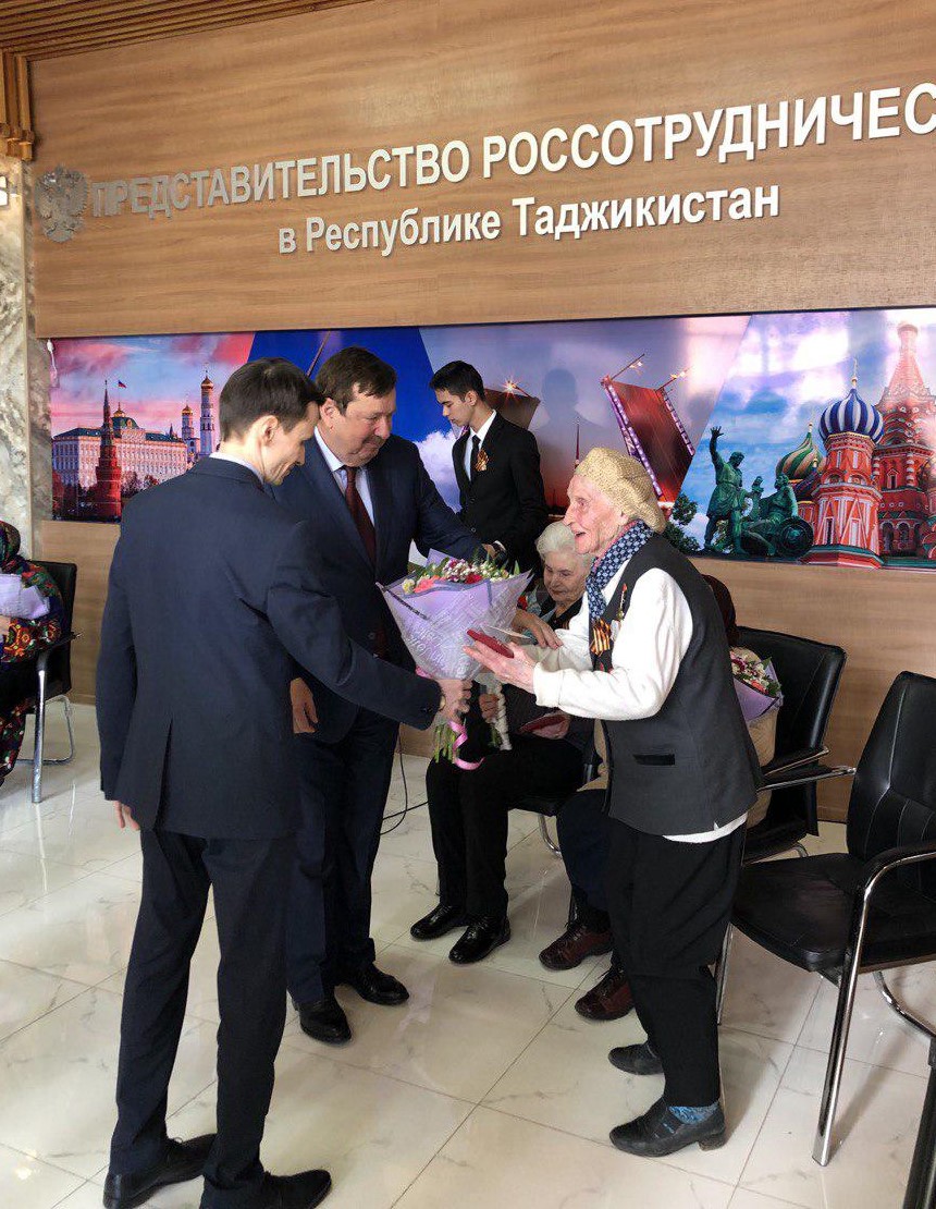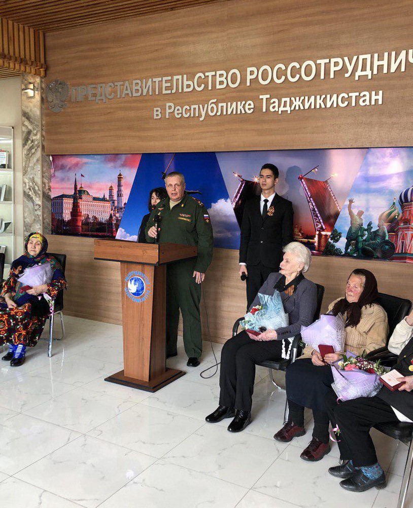 В преддверии празднования 75-й годовщины победы в Великой Отечественной войне в здании представительства «Россотрудничество» в Республике Таджикистан прошло торжественное награждение памятными медалями «75 лет победы в Великой Отечественной войне» ветеранов ВОВ, проживающих в Таджикистане.