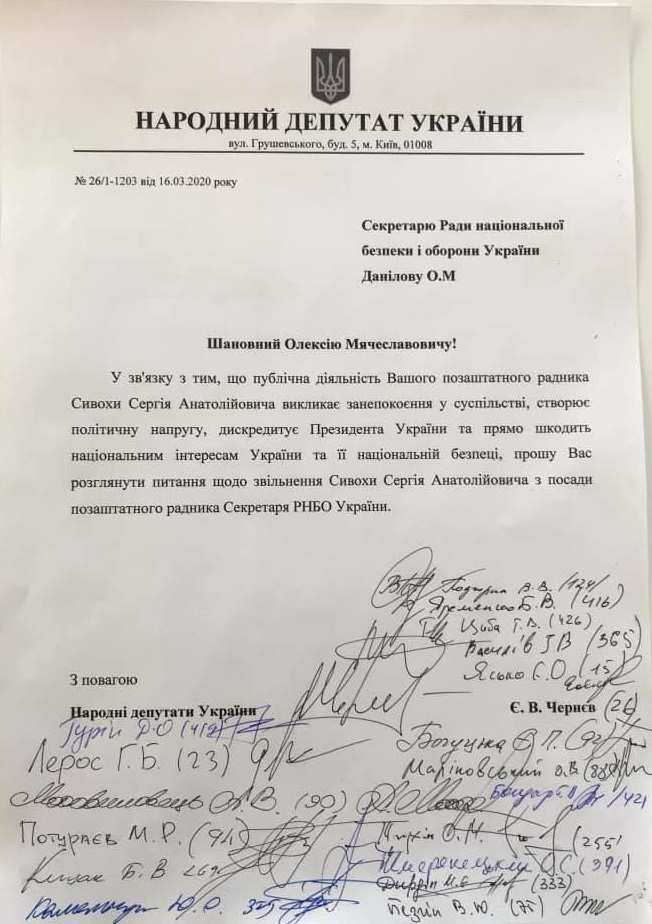 В направленном секретарю СНБО документе парламентариев отмечено, что публичная деятельности Сивохо «вызывает беспокойство в обществе, создаёт публичное напряжение, дискредитирует президента и вредит национальным интересам Украины».