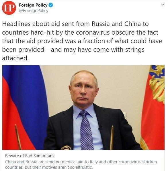 Так, например, издание Foreign Policy в Twitter пишет: «Заголовки о помощи России и Китая сильно пострадавшим от коронавируса странам скрывают тот факт, что это лишь часть того, что могло бы быть предоставлено. Кроме того, эта помощь даётся не просто так».
