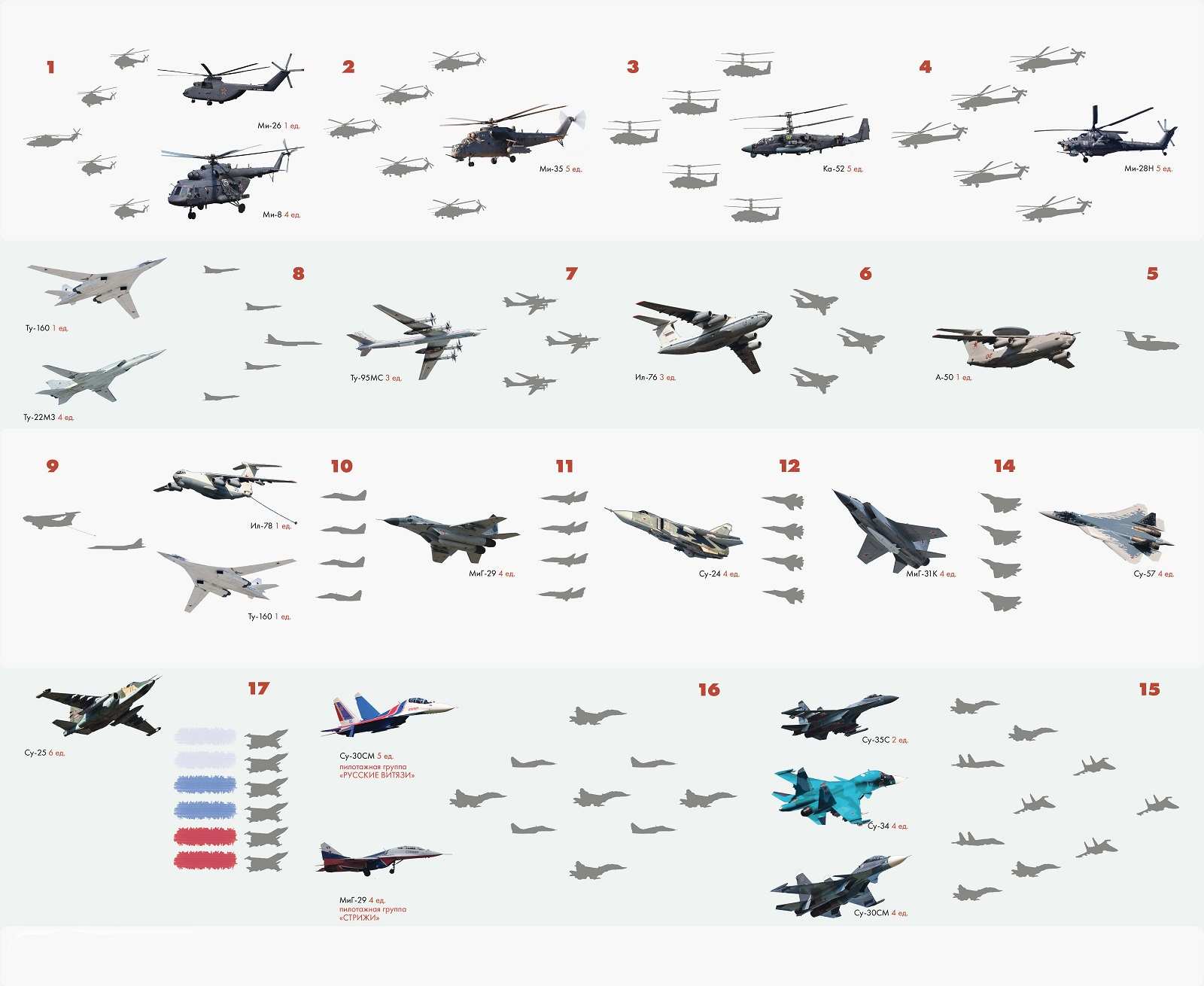 В их числе — истребители МиГ-29, МиГ-31, Су-57, Су-30, Су-35, бомбардировщики Су-24 и Су-34. Среди бортов тяжёлой авиации будут представлены Ту-22М3, Ту-160, Ту-95МС, А-50.