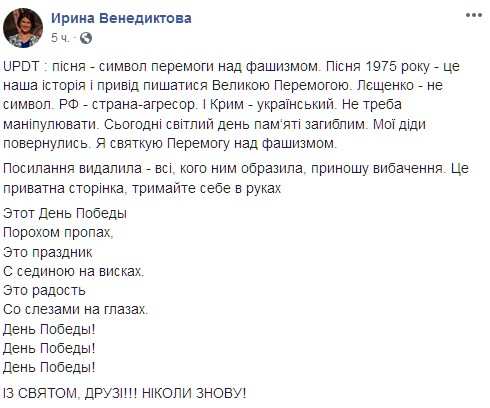 После этого она сделала обновление поста: «Песня — символ победы над фашизмом. Песня 1975 года — это наша история и повод гордиться Великой Победой. Лещенко — не символ. РФ — страна-агрессор. И Крым — украинский. Не надо манипулировать. Сегодня светлый день памяти погибших. Мои деды вернулись. Я праздную Победу над фашизмом. Ссылку удалила — всем, кого ею обидела, приношу извинения. Это частная страница, держите себя в руках», — написала Венедиктова.
