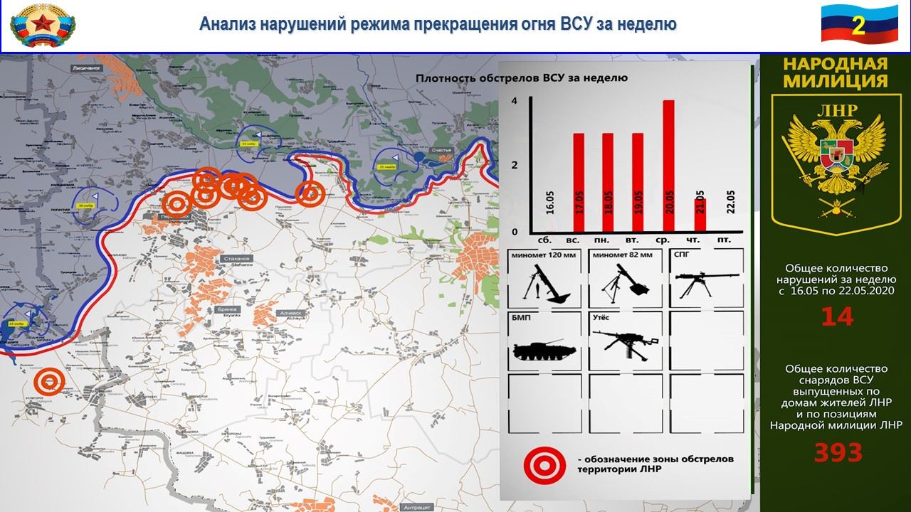 На славяносербском направлении боевики 93 отдельной механизированной бригады ВСУ по приказу военного преступника Брыжинского обстреляли из вооружения БМП, минометов калибра 120 и 82 мм и крупнокалиберных пулеметов н.п. Донецкий, Березовское, Фрунзе, Желобок, Голубовское, Смелое и Золотое-5.
