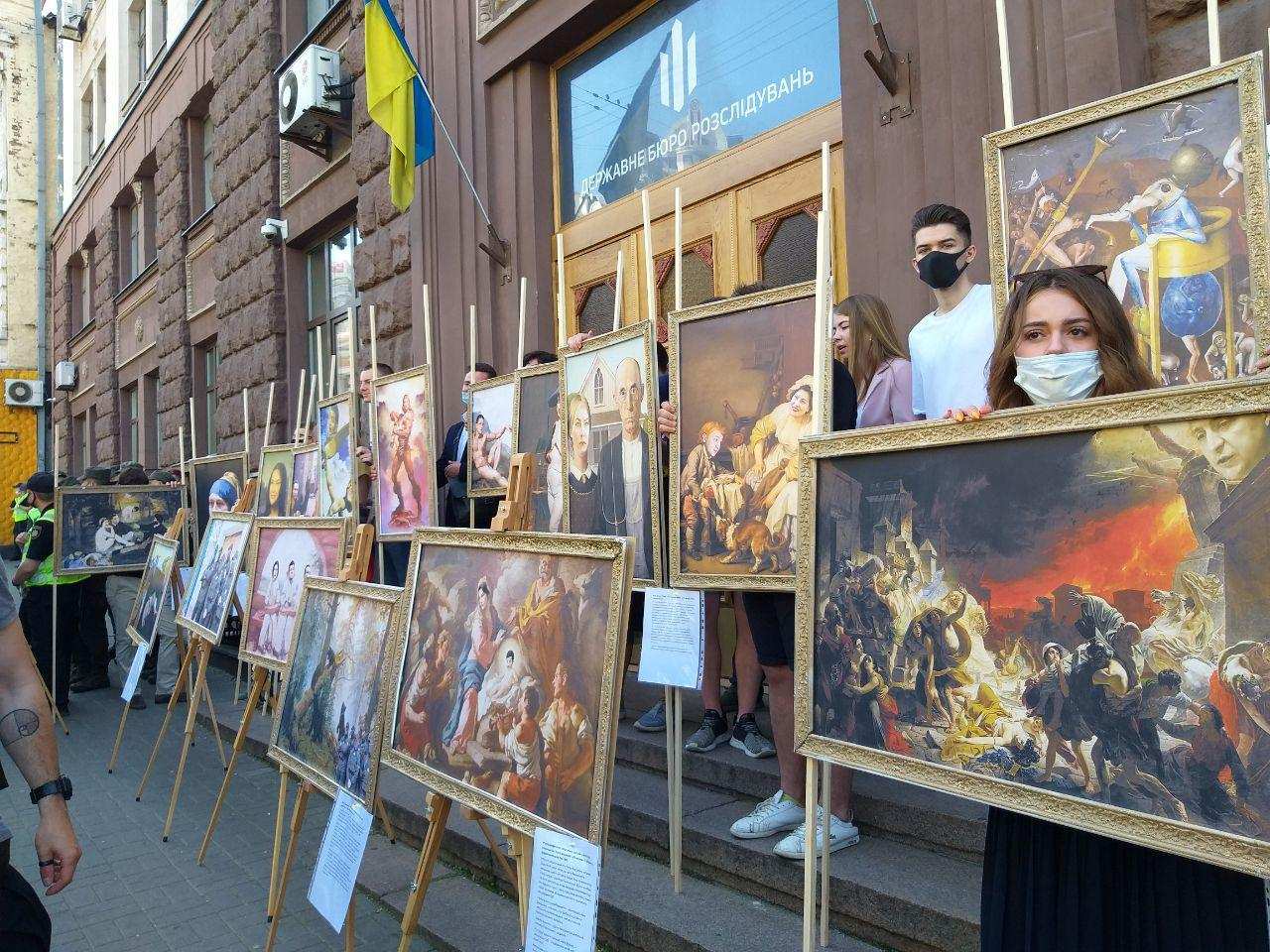 В появлении Порошенко у здания ГБР прослеживались явные черты балагана: его сторонники, среди которых солировал скандально известный Алексей Гончаренко, принесли к ведомству коллажи, где на известных полотнах изображены украинские политики и чиновники команды Зе. Картины после «выставки» обещают передать в ГБР на память.