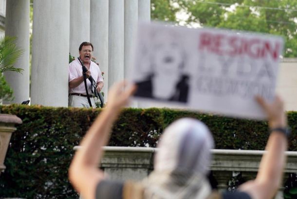 Активисты движения Black Lives Matter снова пришли к дому супругов-адвокатов в Сент-Луисе, ставших известными после того, как несколько дней назад с оружием в руках встали на защиту своего имущества от мародеров.