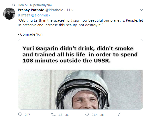 Немного позже Маск ретвитнул публикацию другого пользователя — это тоже фото, на нём наш навеки первый с позывным Кедр и подпись «Юрий Гагарин всю жизнь не пил, не курил и тренировался только для того, чтобы на 108 минут вырваться из СССР».