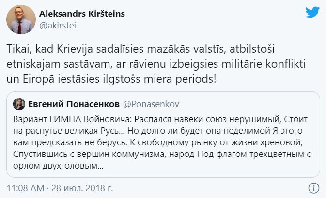 «Только тогда, когда Россия распадается на малые страны по этническому составу, военные конфликты закончатся, а в Европе установится мир на многие годы», — написал Кирштейнс в своем Twitter.