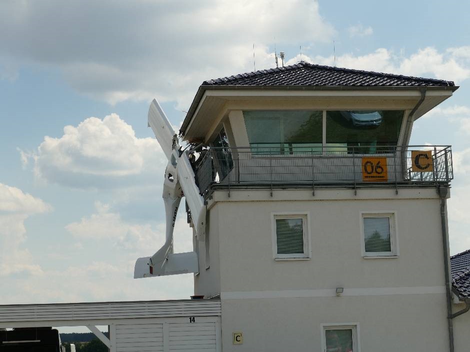 В Германии легкомоторный самолет врезался в диспетчерскую башню и застрял в ней.