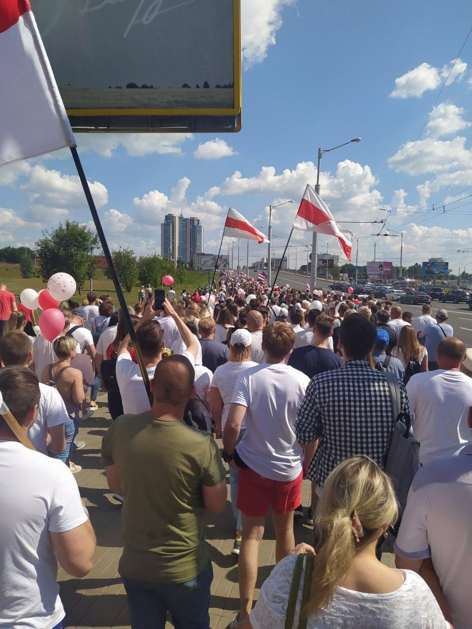 Толпа протестующих у стелы скандирует: «Лукашенко — в автозак, Лиду — в автозак!» (имеется в виду глава ЦИК РБ Лидия Ермошина — прим. РВ).