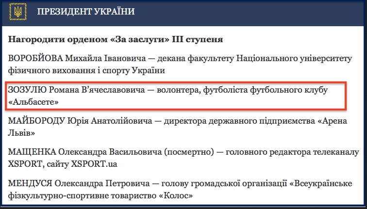 Ко Дню физической культуры президент Владимир Зеленский наградил ряд спортсменов и деятелей, работа которых связана со спортом. Среди них из ныне играющих футболистов только один — Роман Зозуля, игрок клуба «Альбасете».