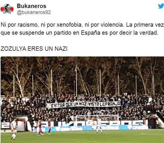 Правда ультрас Райо Вальекано (они называют себя Bukaneros) отвергли такую трактовку. После матча они обратились к украинскому футболисту в Twitter: «Ни за расизм, ни за ксенофобию, ни за насилие. Впервые игру приостановили в Испании, чтобы сказать правду. Зозуля, ты — нацист».