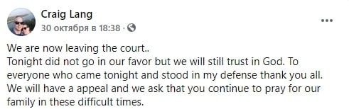 «Сегодня нам не повезло, но мы все еще верим в Бога. Всем, кто пришел в этот вечер и встал на мою защиту, — спасибо вам. Мы подадим апелляцию и просим вас и дальше молиться за нашу семью в эти трудные времена», — написал сам Лэнг в Facebook.