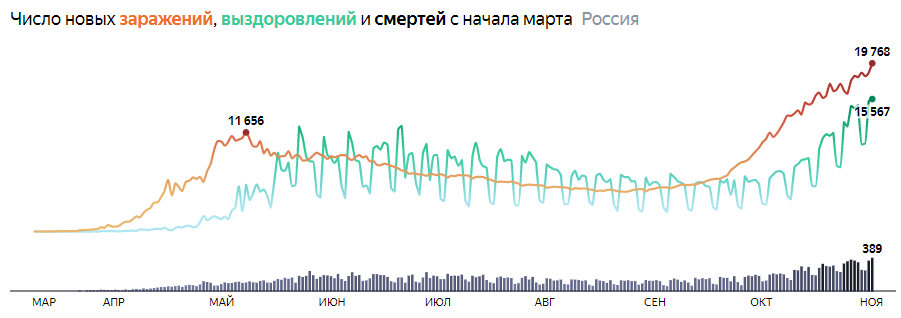 За последние сутки в России выявлено 19 768 новых случаев заражения коронавирусом. Это очередной антирекорд прироста, рубеж в 19 тыс. заболевших за один день преодолён в нашей стране впервые.