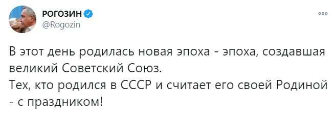 «В этот день родилась новая эпоха — эпоха, создавшая великий Советский Союз. Тех, кто родился в СССР и считает его своей Родиной — с праздником!» — написал он, разместив небольшой тематический видеоролик с поздравлениями.