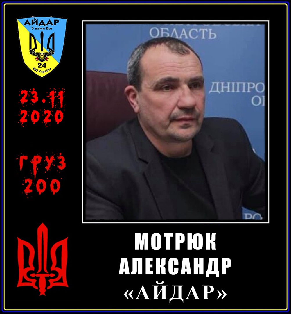 23.11.2020 — Мотрюк Александр Васильевич, 1970 г. р., участник «АТО», доброволец батальона «Айдар». Свою расплату за жизни невинно убиенных мирных жителей Донбасса получил в результате осложнений от COVID-19. На родине «героя и защитника» «незалежной» в г. Днепропетровске Днепропетровской области осталась семья.