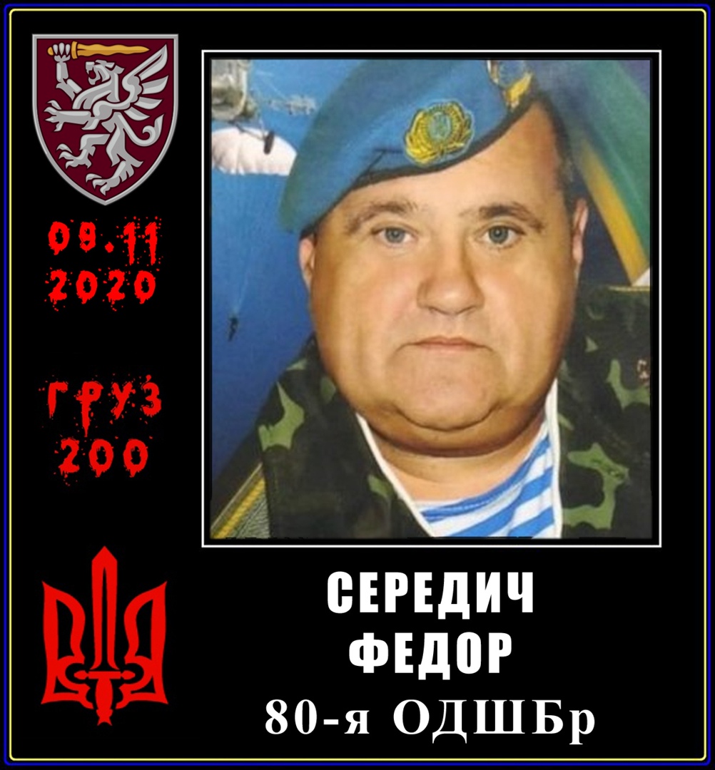09.11.2020 — Середич Федор, 1962 г. р., участник «АТО», 80-я ОДШБр. Свою расплату за жизни невинно убиенных мирных жителей Донбасса получил в результате смерти от тяжелой болезни. На родине «героя и защитника» «незалежной» в г. Дрогобыче Львовской области остались жена, дети.