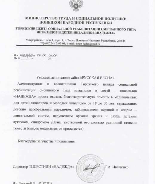 Мы получили письмо из Торезского центра социальной реабилитации «Надежда» для инвалидов и детей-инвалидов, страдающих детским церебральным параличом, заболеваниями нервной и опорно-двигательной систем, нарушением органов зрения и слуха, детским аутизмом и синдромом Дауна (список медикаментов прилагается).