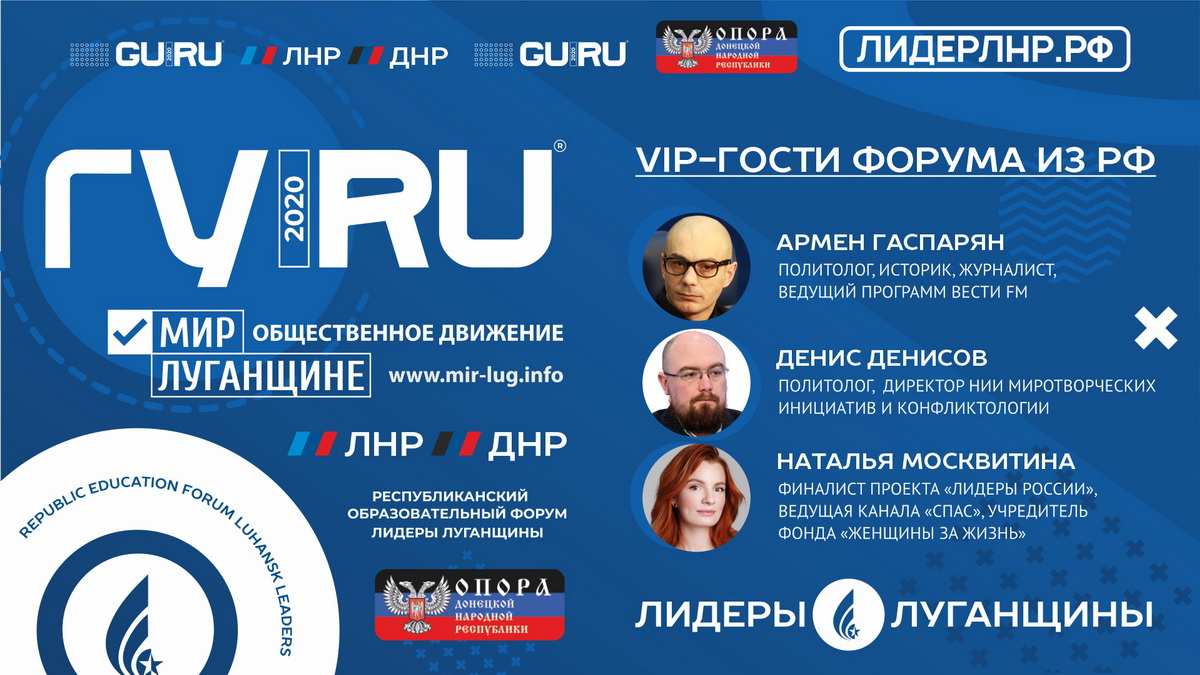 В Луганске и Донецке 12 декабря продолжается образовательный форум #ГУRU с финалистами проектов «Лидеры Луганщины» и «Опора ДНР». С 12.00 стартовала онлайн-конференция с участием финалистки проекта «Лидеры России» Натальей Москвитиной, политологами из России Арменом Гаспаряном и Денисом Денисовым и фронтменом группы «Марсель», певцом Степаном Ледковым.