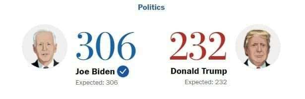 Байден получил 306 голосов выборщиков, тогда как действующий президент США, республиканец Дональд Трамп — 232 голоса.