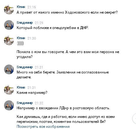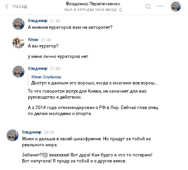 «Мужчина начал свое письмо с угроз. Виной тому стала публикация на моей странице о том, что в одном из своих свежих интервью депутат Госдумы Александр Шерин заявил, что ДНР и ЛНР следует включить в состав Ростовской области РФ. Он пояснил, что из-за этой публикации у меня будут проблемы с МГБ ДНР и якобы у него есть личный контакт с Александром Ходаковским. А после и вовсе начал рассказывать, что он якобы куратор, которого прислали из РФ, и сейчас работает старшим специалистом в Министерстве молодежи, спорта и туризма ЛНР».