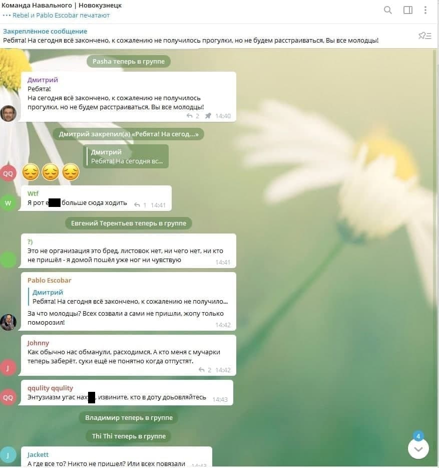 В чатах сторонник Навального интересуется, кто же теперь заберёт его «с мусарки». Остальные выражают разочарование в протестных митингах, правда, в крайне нецензурной форме.