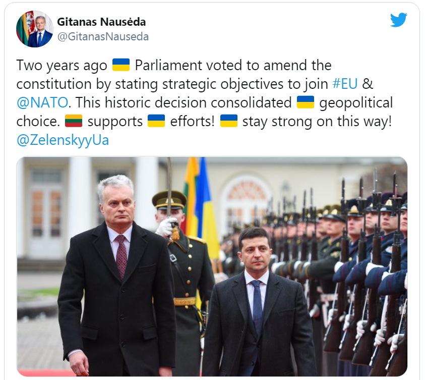 Во вторую годовщину внесения изменений в Конституцию Украины, закрепивших стратегический курс «незалежной» в ЕС и НАТО, Науседа отметился постом на своей официальной странице в соцсети.