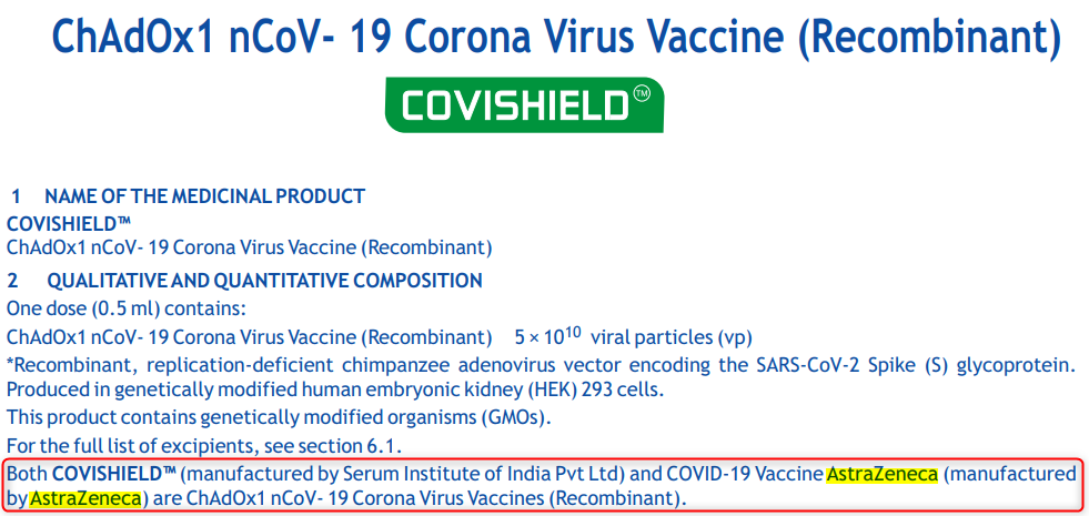 Более того, в спецификации товара на сайте производителя указывается, что Serum Institute производит свою вакцину, а компания AstraZeneсa — свою. Хотя и говорится, что у них общий принцип действия. Но подчеркивается, что «Астру» делают на мощностях самой AstraZeneсa.