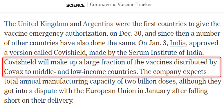 «Covishield будет составлять значительную часть вакцин, распространяемых Covax в странах со средним и низким уровнем доходов», — говорится на сайте газеты.