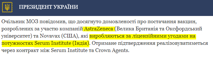 У Зеленского ее назвали AstraZeneсa. Однако на сайте компании-производителя Serum Institute такой продукт не указан. Он не производится ни в самой Индии, ни на заводах компании за рубежом.