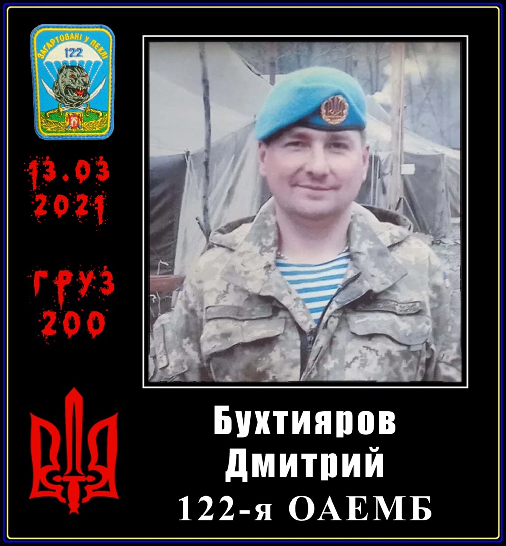 13.03.2021 — Бухтияров Дмитрий Юрьевич, 1976 г. р., военнослужащий 122 ОАЕМБ. В 2015 году добровольно отправился в зону «АТО»/«ООС», где за деньги истреблял мирное население Донбасса.