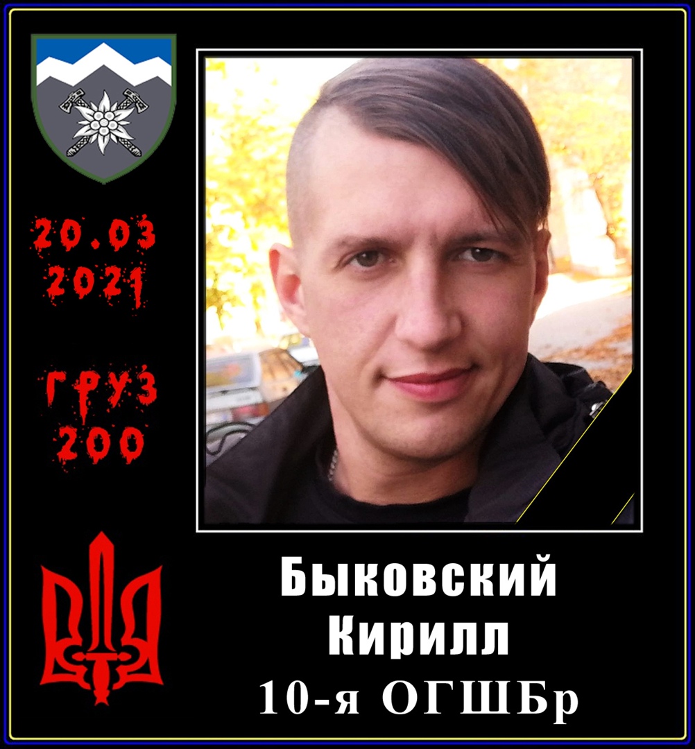 20.03.2021 — Быковский Кирилл Сергеевич, 1992 г. р., солдат, наводчик подразделения 109 ОГШБ, 10 ОГШБр. В 2018 году добровольно отправился в зону «АТО»/«ООС», где за деньги истреблял мирное население Донбасса.