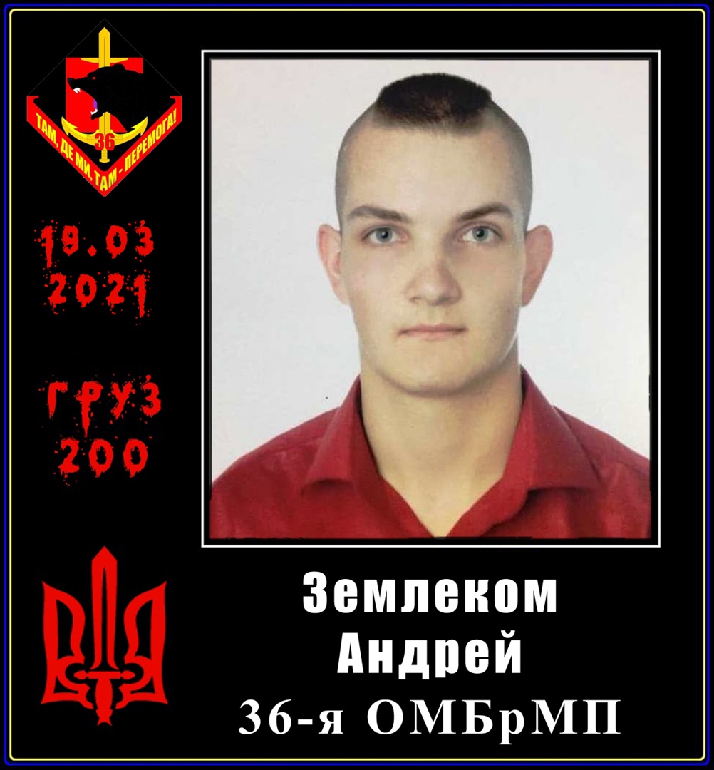 19.03.2021 — Землеком Андрей Владимирович, 1995 г. р., младший сержант подразделения 36 ОБрМП. Свою расплату за жизни невинно убиенных мирных жителей Донбасса получил в результате боестолкновения с силами Л/ДНР.