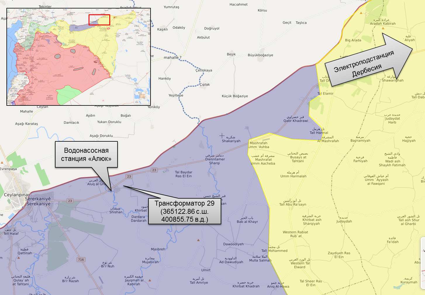 Было установлено, что турецкой стороной осуществляется незаконное подключение к линии электропередач от электроподстанции «Дербисия» до водонасосной станции «Алюк» в районе трансформатора № 29, что приводит к повышенному электропотреблению электростанции и сбоям в работе насосов на водонасосной станции, в результате чего в провинцию Хасака вода поступает с большими перебоями.