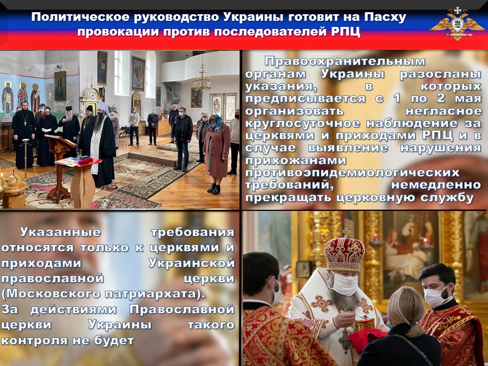 Так, по полученной информации, правоохранительным органам Украины разосланы указания, в которых предписывается с 1 по 2 мая организовать негласное круглосуточное наблюдение за церквями и приходами Украинской православной церкви (Московского патриархата) и в случае выявления нарушения прихожанами правил социальной дистанции и противоэпидемиологических требований, немедленно прекращать церковную службу, религиозных деятелей задерживать.