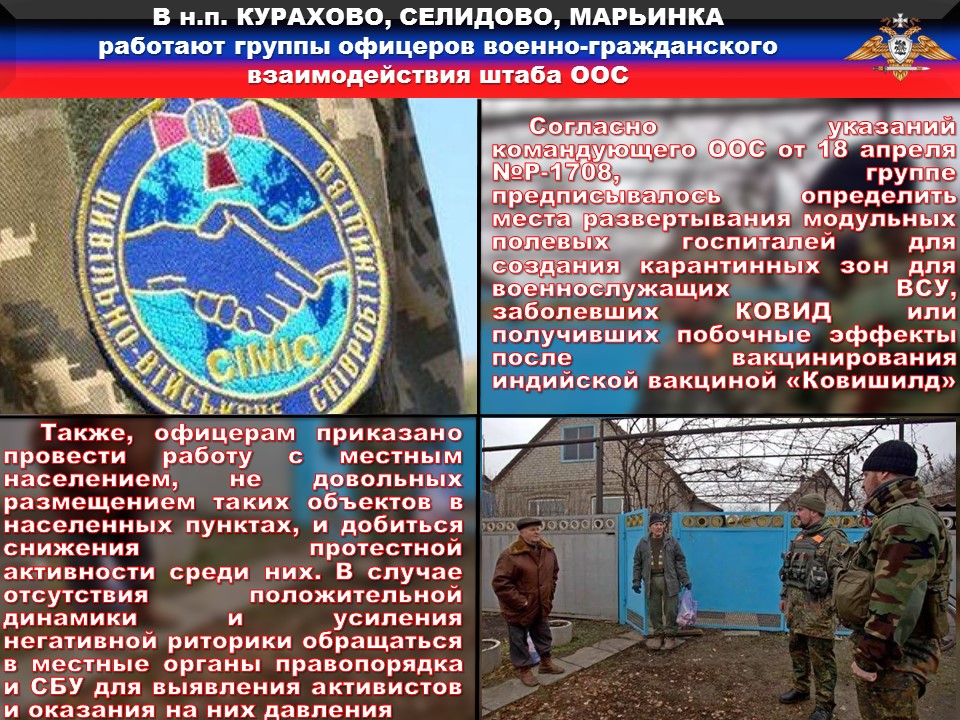 Нашей разведкой получены данные о работе в н. п. Курахово, Селидово и Марьинка группы офицеров военно-гражданского взаимодействия штаба «ООС».
