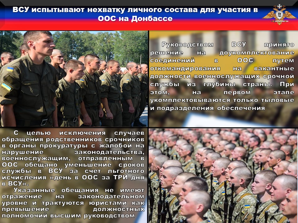 Так, по полученным данным, руководством ВСУ принято решение на доукомплектование соединений в «ООС» путем откомандирования на вакантные должности военнослужащих срочной службы из глубины страны.