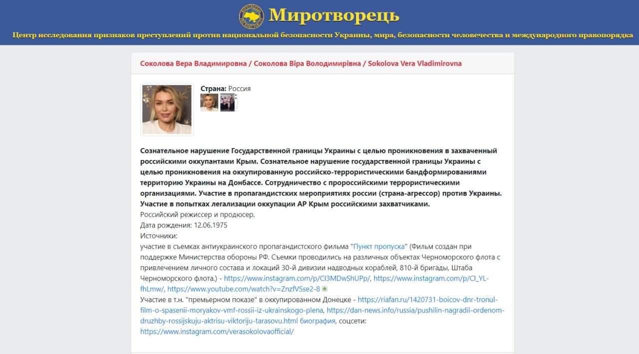 Съемочная группа фильма «Пункт пропуска» была занесена на украинский сайт «Миротворец». В базу внесены режиссер Вера Соколова, оператор Леонид Рудкевич, актеры Анастасия Черникова, Валерий Карпов, Александр Зачиняев, Борис Эстрин, Кирилл Емельянов, Дмитрий Шиляев, заслуженный артист РФ Михаил Калиничев, народный артист РФ Эммануил Виторган.