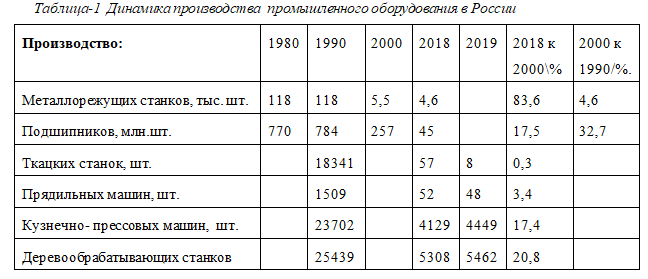 На таблице 2 дана динамика станкопарка. Как видно, в 2009 г. произведено 1,9 тыс. металлорежущих станков; в 2018 всего 4,6 тыс., что в 26 раз меньше, чем в 1980 г., и в 2019 г. снова наблюдалось падение.