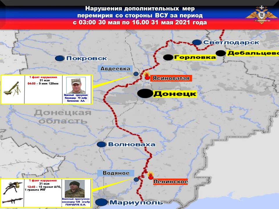 На донецком направлении боевики 72-й бригады по приказу комбрига Богомолова с позиций в районе н. п. Авдеевка выпустили девять мин калибром 120 мм по району н. п. Ясиноватая.