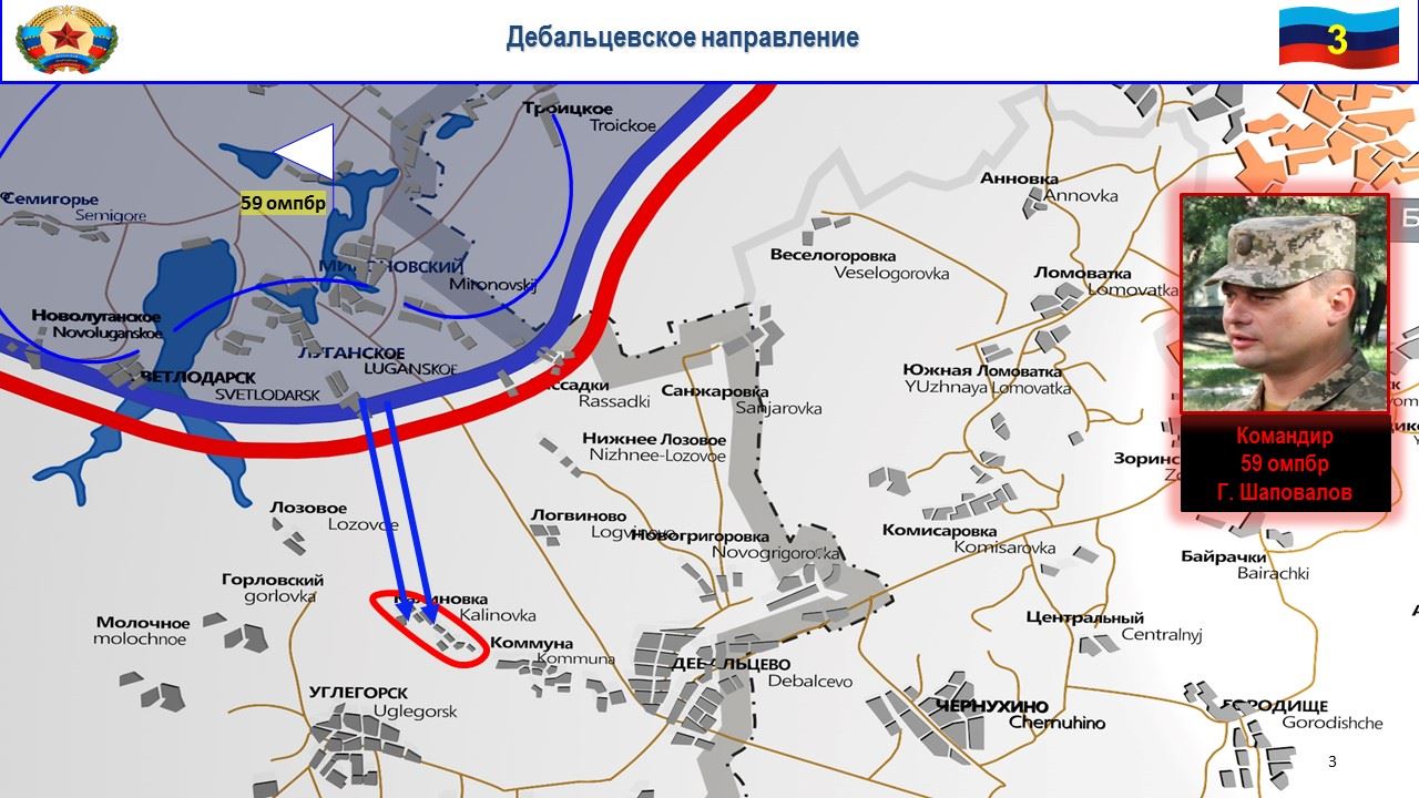 На дебальцевском направлении боевики 59-й бригады ВСУ по приказу комбрига Шаповалова с позиций в районе н.п. Луганское подвергли обстрелу из станкового противотанкового гранатомёта и крупнокалиберных пулеметов район н.п. Калиновка.