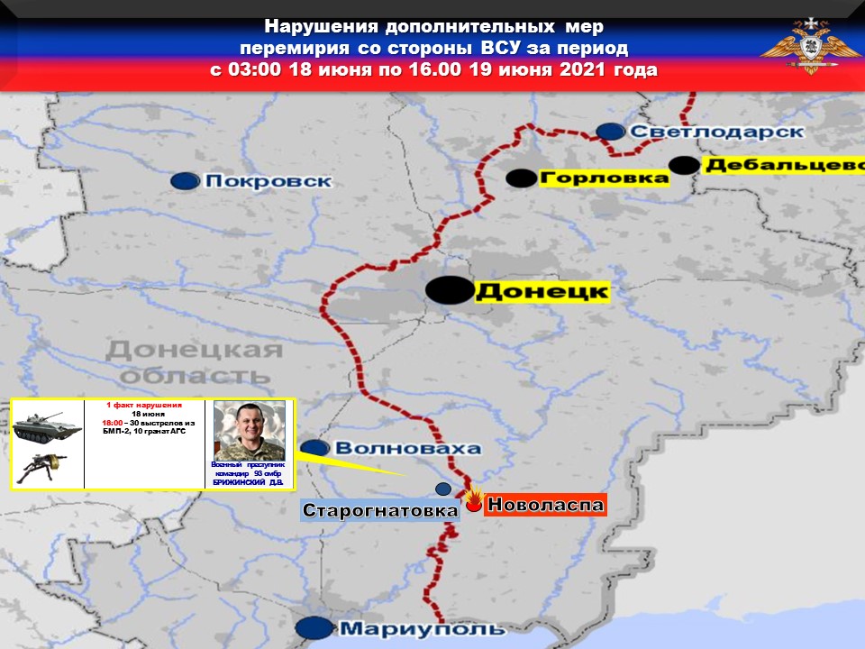 На мариупольском направлении боевики 3-го батальона 93-й омбр по приказу комбрига Брыжинского с позиций в районе н. п. Старогнатовка обстреляли район н.п Новоласпа из БМП-2 и АГС, выпустив по поселку сорок боеприпасов.