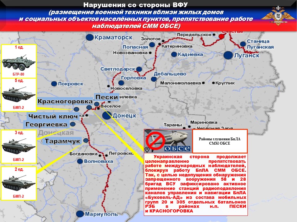 Украинская сторона продолжает целенаправленно препятствовать работе международных наблюдателей, блокируя работу БпЛА СММ ОБСЕ. Так, с целью недопущения обнаружения запрещенного вооружения 58 и 28 бригад ВСУ зафиксировано активное применение станций радиоподавления каналов управления и навигации БпЛА «Буковель-АД» из состава мобильных групп 20 и 305 отдельных батальонов РЭБ в районах н. п. Пески и Красногоровка.