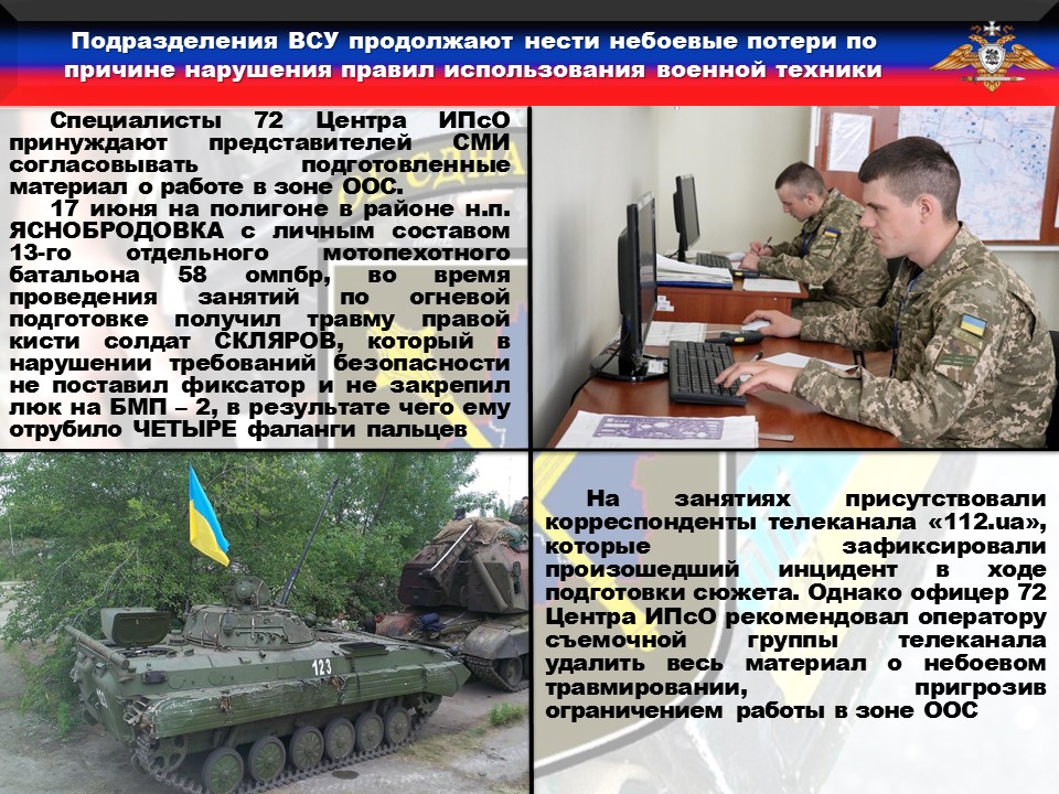 Подразделения ВСУ продолжают нести небоевые потери по причине нарушения правил использования военной техники и непрофессиональных действий экипажей боевых машин, при этом специалисты 72 Центра ИПсО принуждают представителей СМИ согласовывать подготовленные материалы о работе в зоне «ООС».