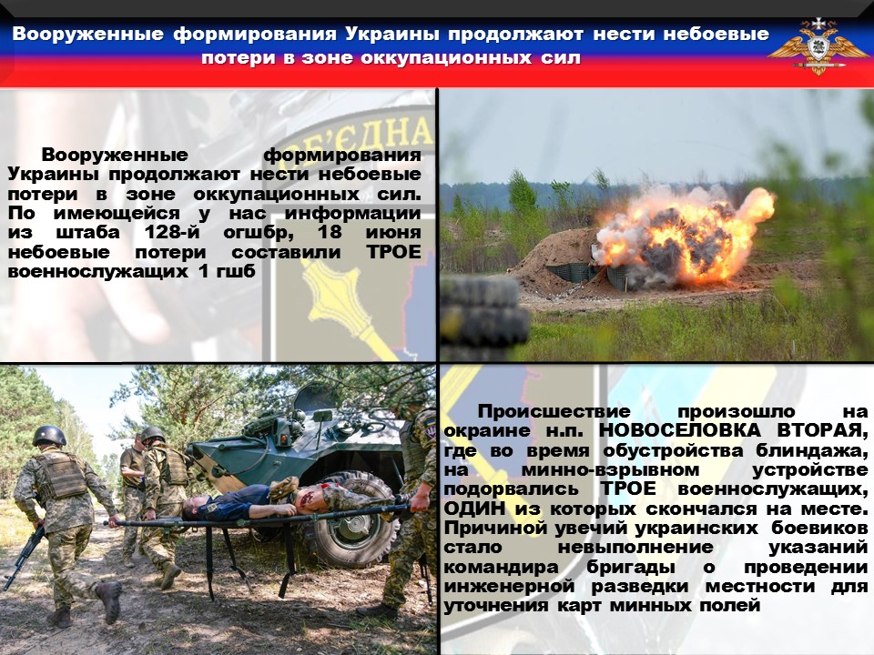 По имеющейся у нас информации из штаба 128-й огшбр, 18 июня небоевые потери составили трое военнослужащих 1 гшб.