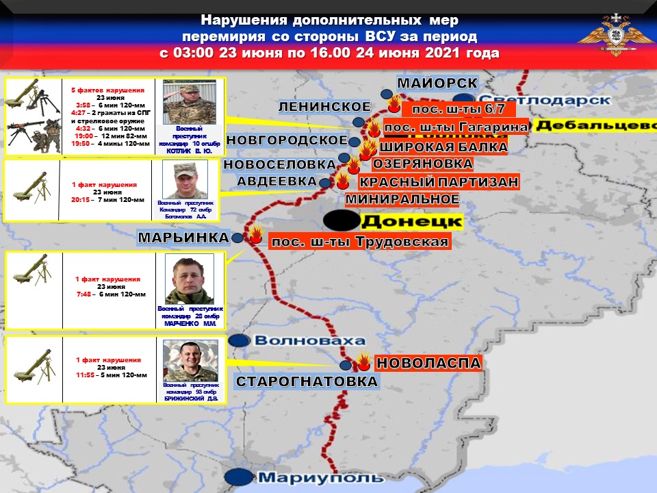 Так, с позиций в районе н. п. Майорск противник обстрелял из СПГ и стрелкового оружия район поселка шахты 6/7, с позиций в районе н. п. Ленинское открыл огонь из 120-мм минометов по поселку шахты им. Гагарина, а с позиций в районе н. п. Новгородское вел огонь из 120-мм и 82-мм минометов по районам н. п. Широкая Балка и Озеряновка, выпустив по населенным пунктам 16 мин калибром 120 мм и 12 мин 82 мм.