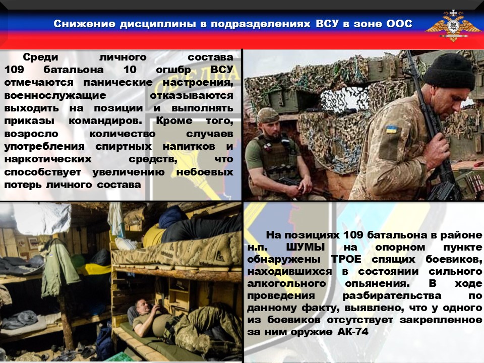 В этой связи среди личного состава 109-го батальона 10-й бригады отмечаются панические настроения, военнослужащие отказываются выходить на позиции и выполнять приказы командиров.